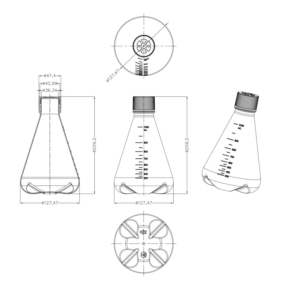 1L Erlenmeyer Flask, Vent Cap, Baffled Bottom, PC, Sterile